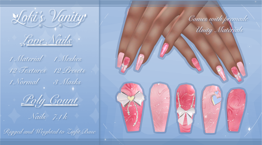 IT IS HIGHLY RECCOMMENDED TO USE THE PRESET MATERIALS I PUT TOGETHER IN UNITY FOR THE NAILS!!! THEY LOOK VERY VERY VERY FLAT OUTSIDE OF UNITY AND DEPEND ON MATCAPS AND METALLICS TO HAVE THEIR SLEEK LOOK!!!
