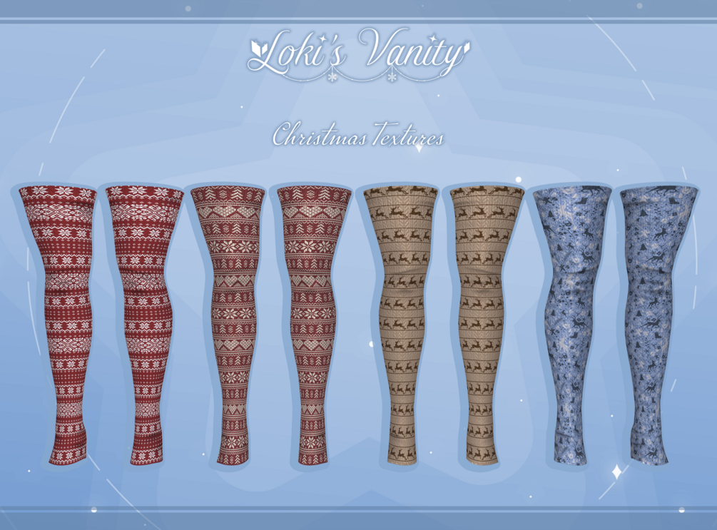 - HOLIDAY TEXTURES ARE ONLY FOR THE SOCKS AND REQUIRE SPLITTING THE MAT, APPLYING AS A DECAL, OR OVERLAPPING THE TEXTURES IN PHOTO SHOP!